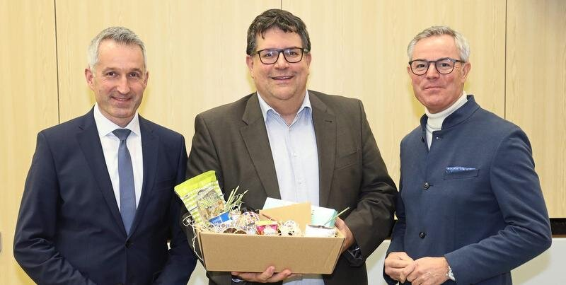 Andreas Vögele (Mitte) ist seit 30 Jahren im Vorstand des Blasmusikbezirks Yburg-Windeck aktiv. Der Vorsitzende, Sven Wilhelm (links), und der Präsident des Blasmusikverbandes Mittelbaden, Tobias Wald, gratulieren. Foto: Ingbert Ruschmann